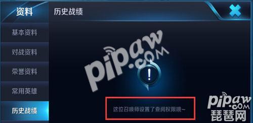 3.然后用别人的账号看一下自己的历史战绩,就会显示“该位召唤师设置了查阅权限哦~”。