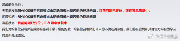 主要的部分的ios机型的玩家在点击活动面板的时候出现闪退的异常问题,目前这个问题已经被官方定位了,并且也在努力的解决中,所以大家唯一能做的就是等待!