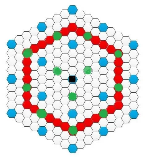 笔者目前了解到的黄金密铺法中,这种辐射类效果最多可以覆盖到12个城市。在后期的奇观分析之辐射效果特别篇中会详细提到,这里只放一张图,铺城点为绿色。中间黑色的位置放博尔戈尔山。只是这样太理想化,地形必须满足关键位置不是山,其次不能有近点AI和城邦,第三需要大量的移民。而且,假如真的这么理想的条件给你遇到了,那么为什么中间不搞个罗马斗兽场呢?为了这个奇观专门规划真的不值得,毕竟限定丘陵沙漠。一堆城市围着沙漠,难免有几座城市就坐在沙漠里了。