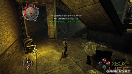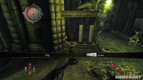 从大门进入后,玩家会来到一座巨大雕像的房间内,这个房间所通往的房间都有机关需要玩家启动。首先走到面对雕像左手边的房间里,玩家要利用手把的RT键跳上石阶,启动右上方的手把。