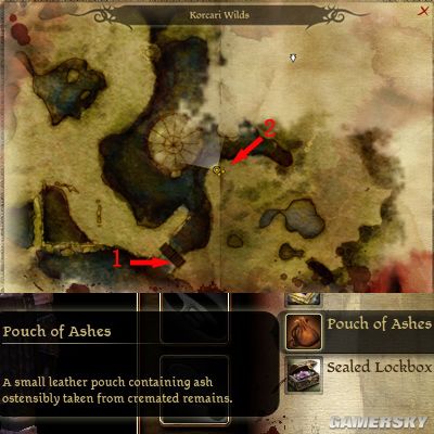 地图中 1 所示的桥,是主线任务的必经之路。在此杀怪可捡到一件道具,Pouch of Ashes。