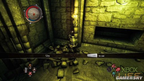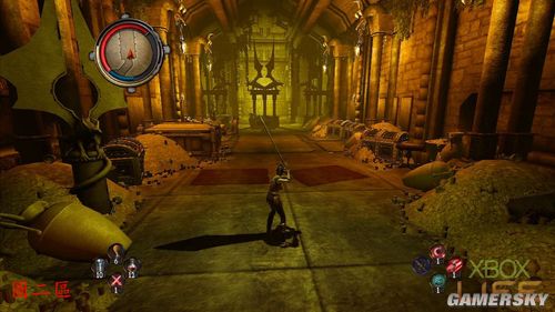 从大门进入后,玩家会来到一座巨大雕像的房间内,这个房间所通往的房间都有机关需要玩家启动。首先走到面对雕像左手边的房间里,玩家要利用手把的RT键跳上石阶,启动右上方的手把。