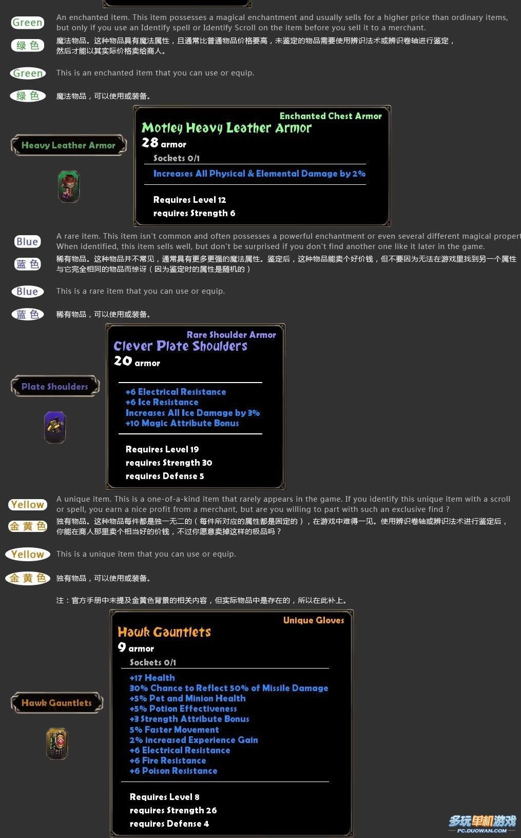 经过数日对 Torchlight 物品颜色的研究、翻译、编写、图文设计和多次改版,终于完成了这张大图,相信能给玩家带来最为详尽权威的 Torchlight 物品颜色知识,无需多言,一切尽在大图中 ;)