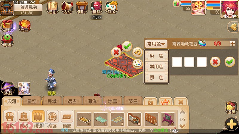需要注意的是,染色需要花费一定数量的花豆,不同家具所需花豆数量不同,如麻布地毯染色需3个花豆,红木八仙桌染色需5个花豆。