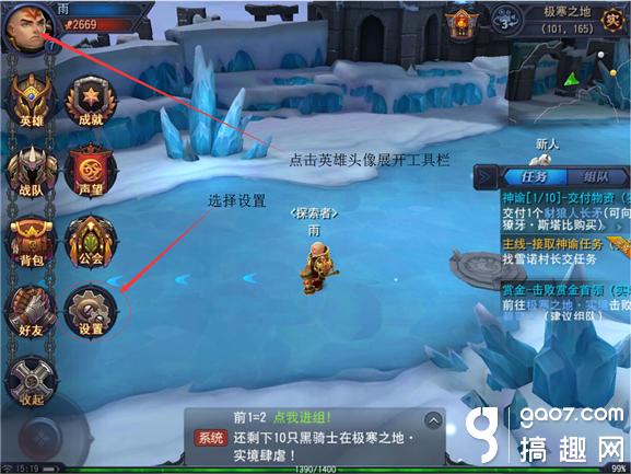 1、点击英雄头像展开“工具栏”选择设置进入游戏设置界面。