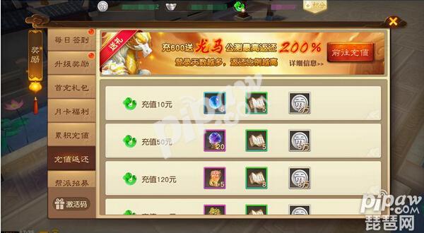 一、点击奖励,有月卡福利、累计充值、充值返还,这些都有专门的充值路口,点进去按照提示直接充值就可以。