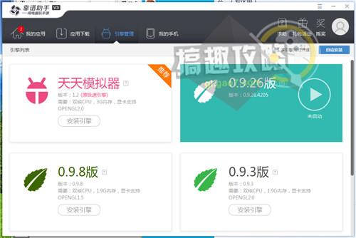 选择自己习惯用的安卓引擎,点击安装,这里推荐如果游戏画质不是非常高的可以用天天或者0.93以上版本。如果是大型游戏最好是用低一些的版本比较流畅。