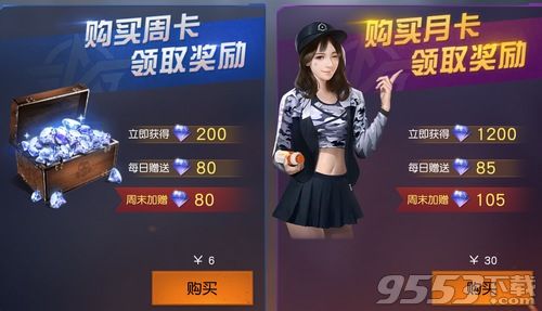 月卡,月卡是30元,立即获得1200钻石,每日赠送85钻石,周末加赠105钻石,一共可以获得4590钻石。